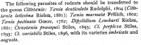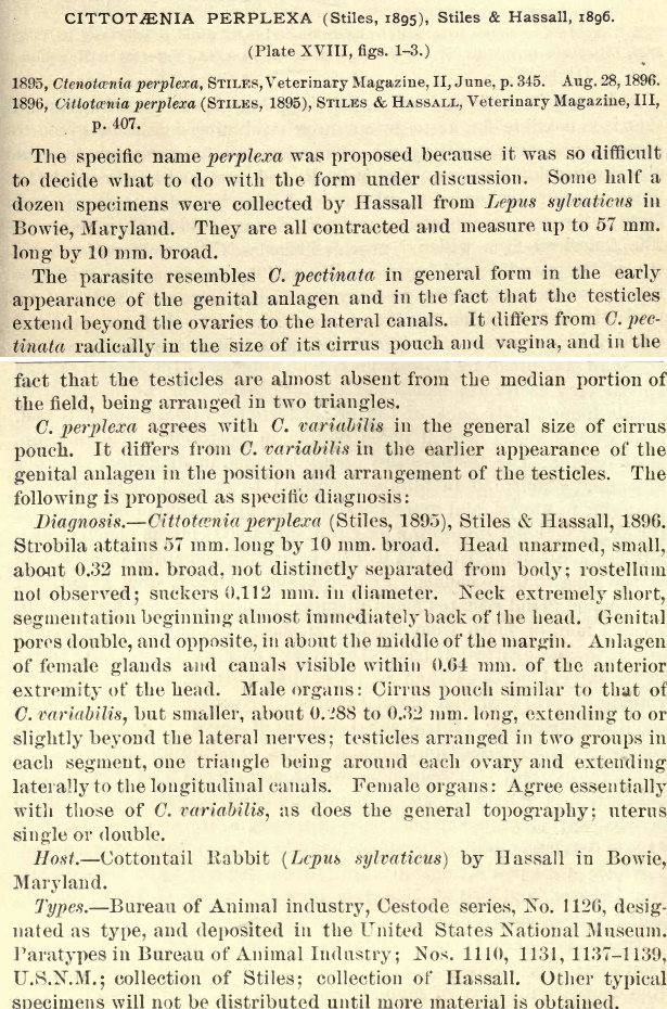 Stiles, C.W. 1895. Notes on parasites-38. Preliminary note to A revision of the adult leporine cestodes. Veterinary Magazine 2: 341-346. (4737) Download PDFStiles, C.W. and A. Hassall. 1896. Notes on parasites-47. On the priority of Cittotaenia Riehm, 1881, over Ctenotaenia Railliet, 1891. Veterinary Magazine 3: 407. (5117) Download PDF |