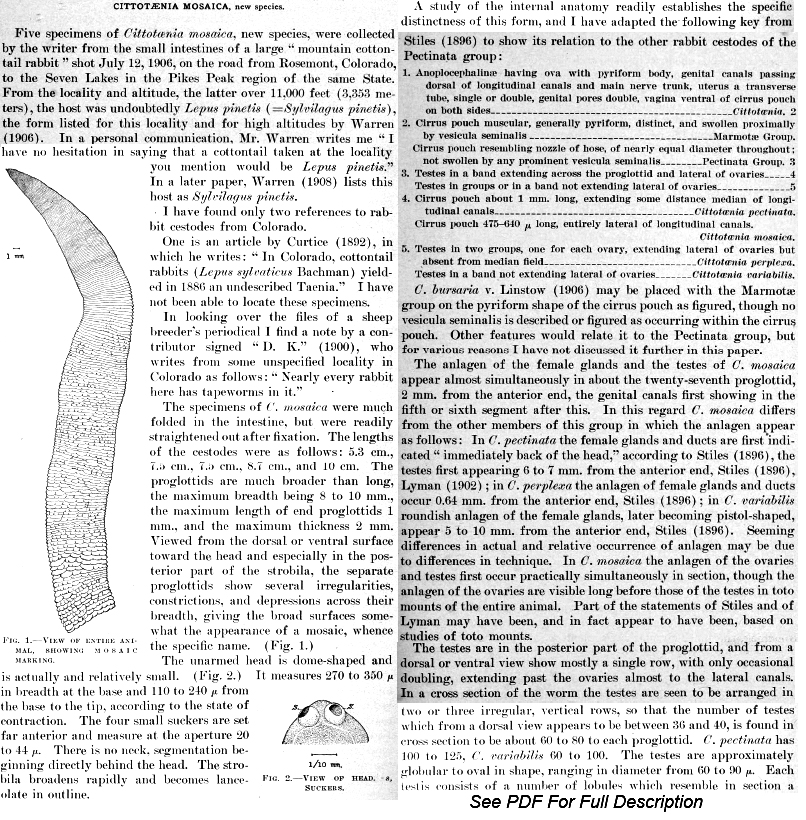 Hall, M. C. 1908. A new rabbit cestode, Cittotaenia mosaica. Proceedings of the United States National Museum 34: 691-699. (4905) Download PDF |