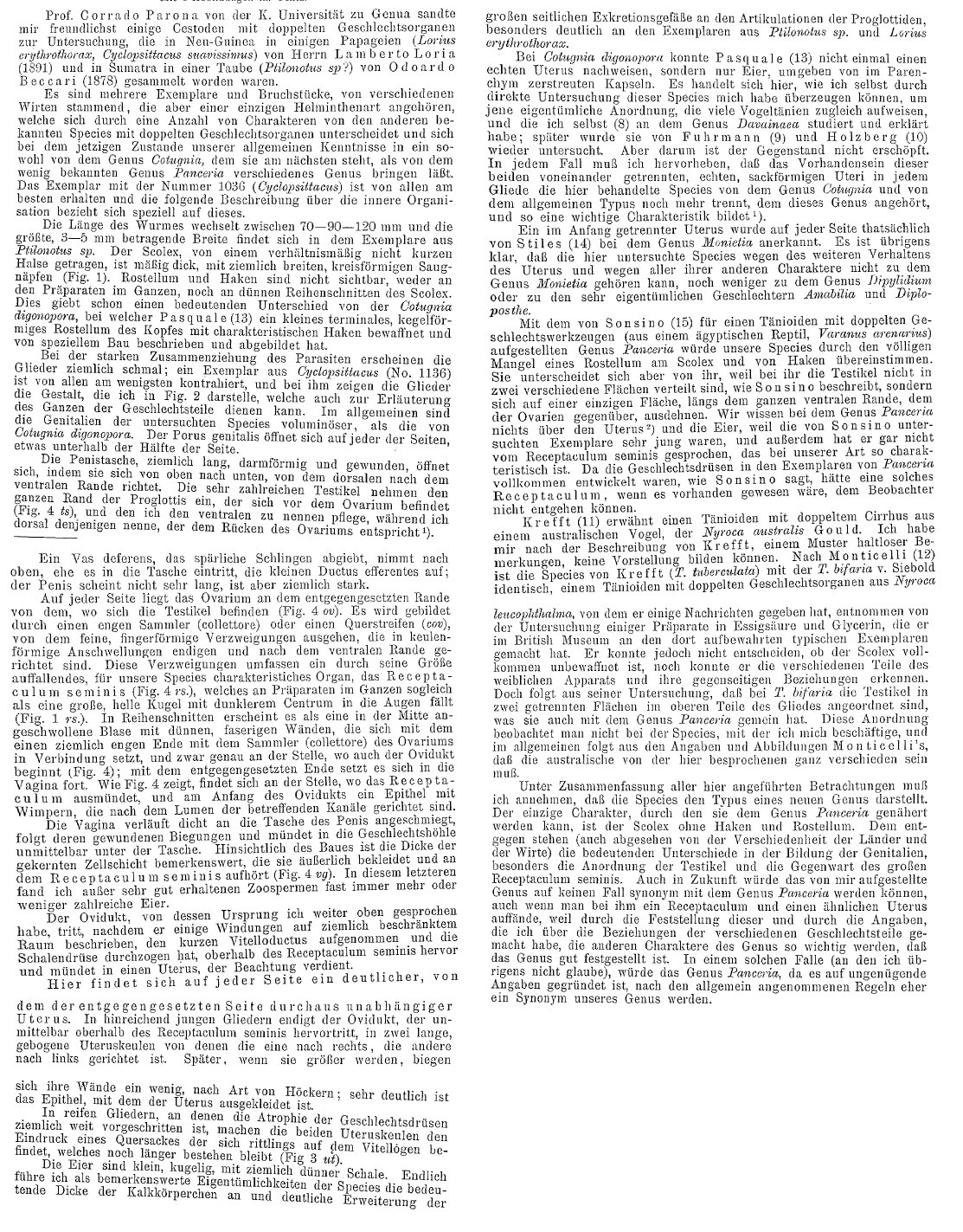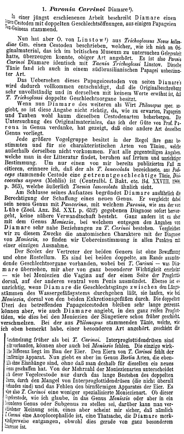 Diamare, V. 1900. Paronia carrinoi, n. g. n. sp. von Tänioiden mit doppelten Geschlechtsorganen. Centralblatt für Bakteriologie und Parasitenkunde, I abt. 28: 846-850. (5205) Download PDFFuhrmann, O. 1901. Bemerkungen über einige Neuere Vogelcestoden. Centralblatt für Bakteriologie, Parasitenkunde und Infektionskrankheiten, I abt 29: 757-761. (5603) Download PDF |