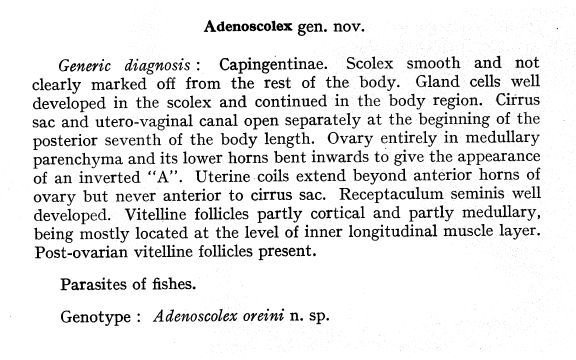 | Type Species | Adenoscolex oreini Fotedar, 1958 |