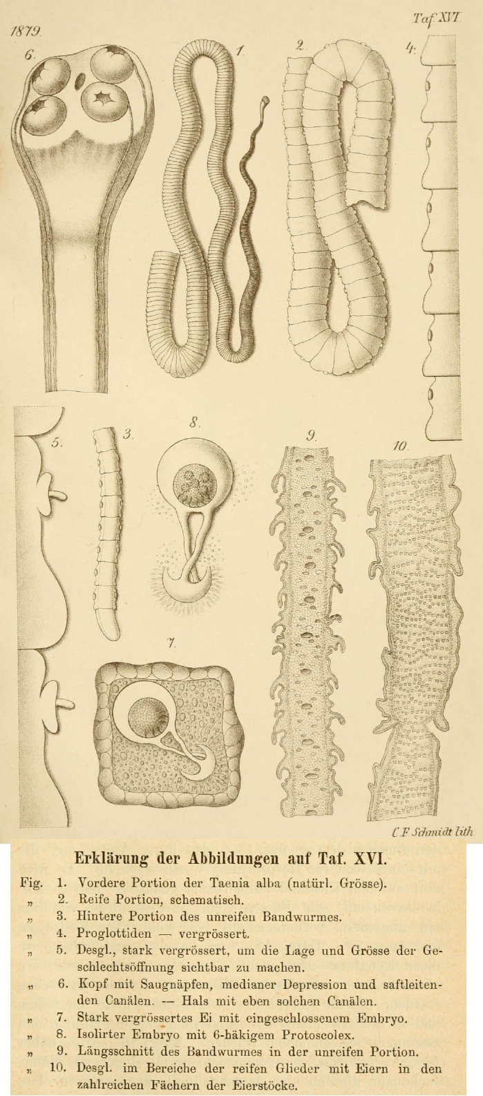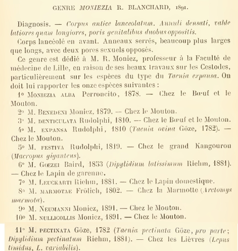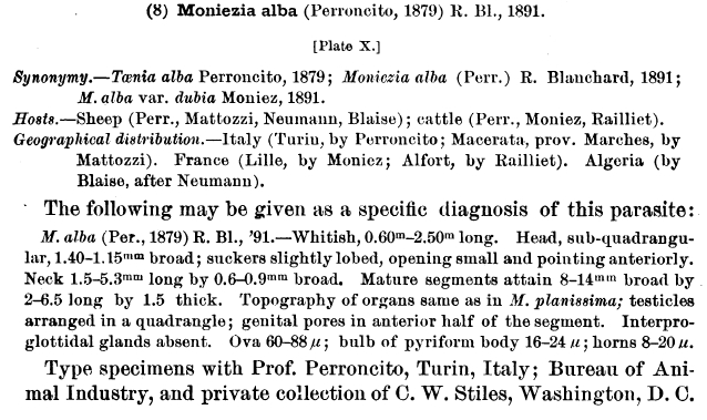 Perroncito, E. 1879. Ueber eine neue Bandwurmart (Taenia alba). Archiv für Naturgeschichte 45: 235-237. (5034) Download PDFBlanchard, R. 1891. Notices helminthologiques (deuxième série). Mémoires de la Société Zoologique de France 4: 420-466. (4633) Download PDF |