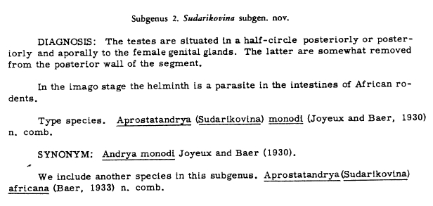 | Synonyms | Andrya africana Baer, 1933; Aprostatandrya (Sudarikovina) africana (Baer, 1933) Spasskii, 1951 |