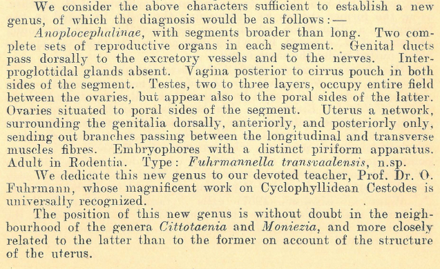 | Type Species | Fuhrmannella transvaalensis Baer, 1924, syn. Moniezia transvaalensis (Baer, 1924) Baylis, 1935 |