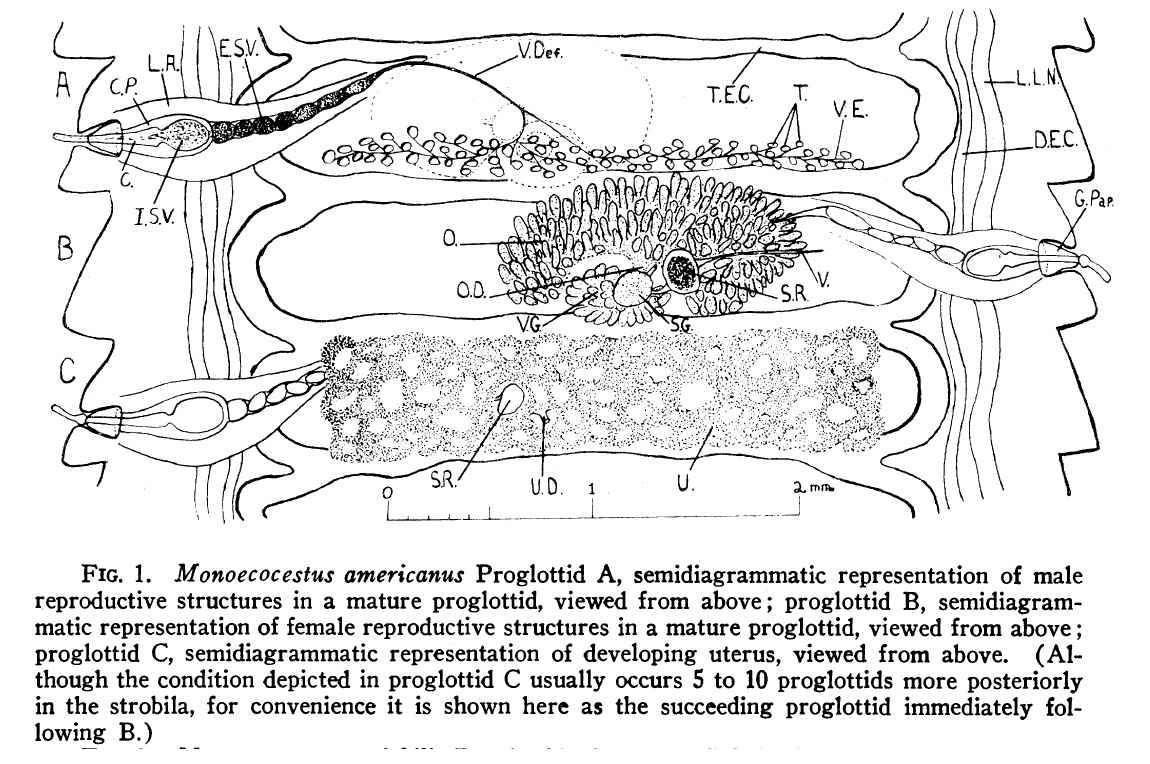 Freeman, R. S. 1949. Notes on the morphology and life cycle of the genus Monoecocestus Beddard, 1914 (Cestoda: Anoplocephalidae) from the porcupine. Journal of Parasitology 35: 605-612. (5052) Download PDF |