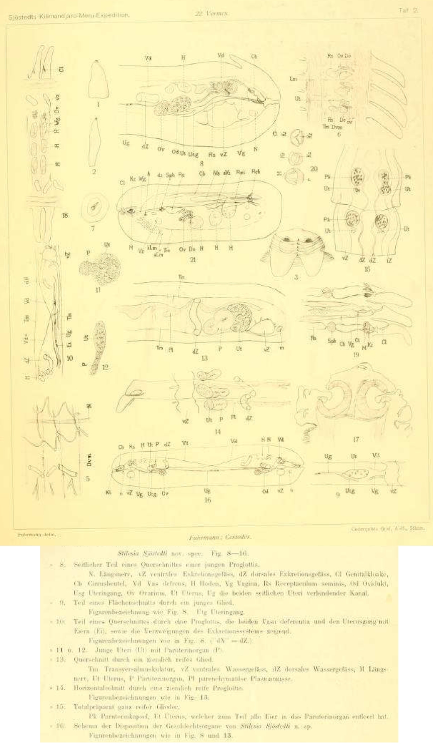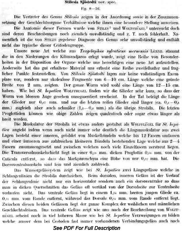 Fuhrmann, O. 1909. Vermes 2. Cestodes. Wissenschftliche Ergebnisse der Schwedischen Zoologischen Expedition nach dem Kilimandjaro, dem Meru und dem umgebenden Massaisteppen Deutsch Ostafrikas 1905-1906 3(22): 11-22.
