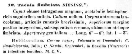 Diesing, K. M. 1850. Systema Helminthum, Vol. I. Wilhelmum Braumüller, Vindobonae [Vienna], 679 pp. (18)Moniez, R. 1891. Notes sur les helminthes. Especes nouvelles ou peu connues du genre Moniezia. Revue Biologique du Nord de la France 4: 65-79. (4746) Download PDF |