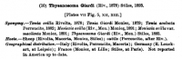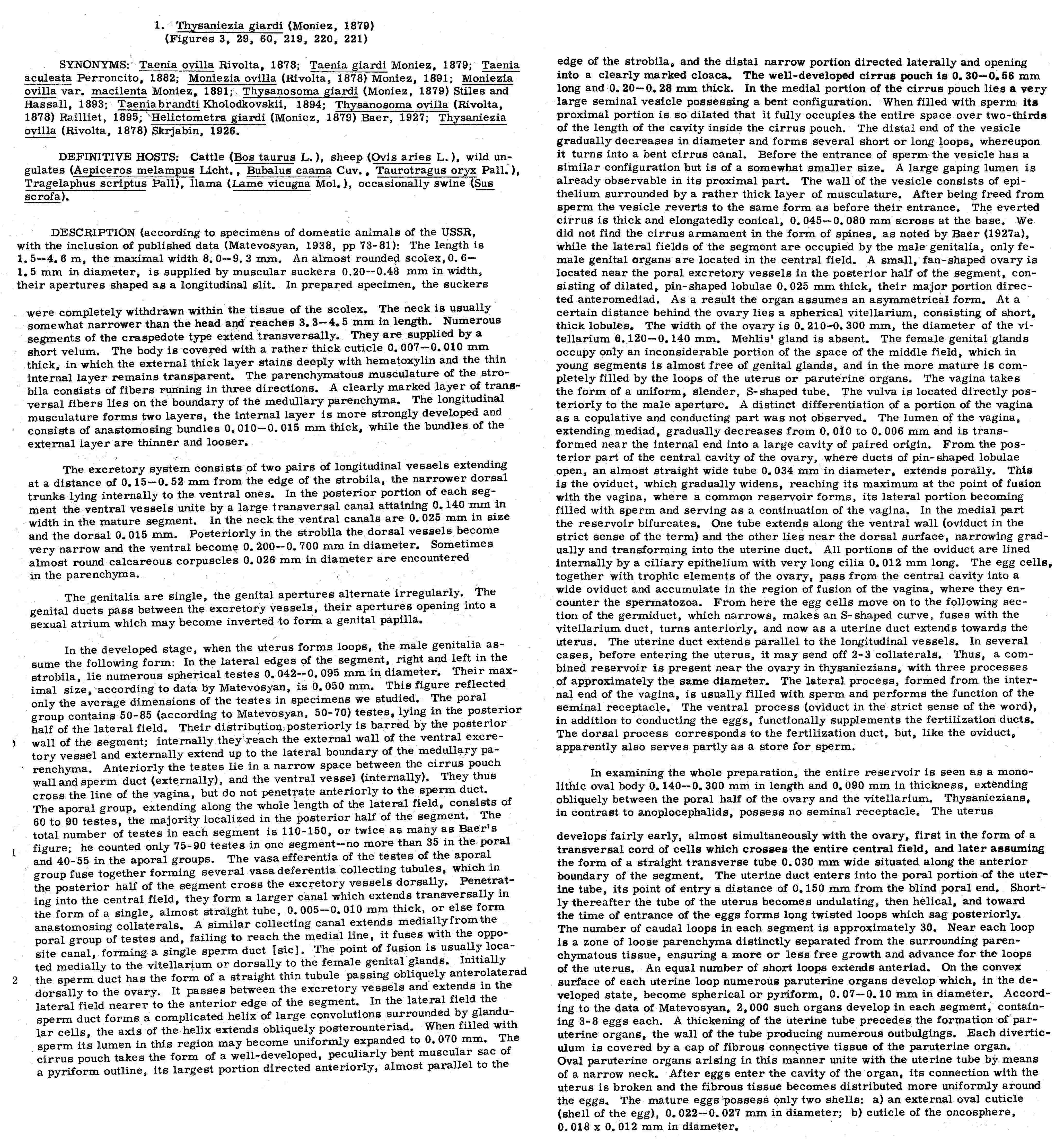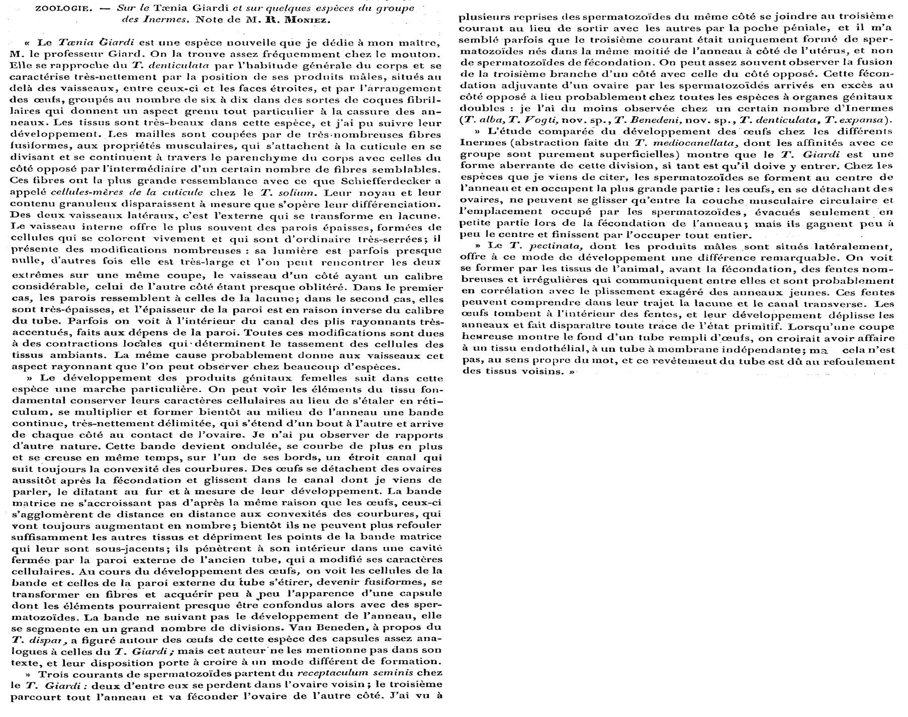 Moniez, R. 1879. Sur le Taenia giardi et sur quelques espèces du groupe des Inermes. Comptes Rendus Hebdomadaires des Seances de l’Academie des Sciences 88: 1094-1096. (5604) Download PDFStiles, C. W and A. Hassall. 1893. A revision of the adult cestodes cattle, sheep, and allied animals. Bulletin of the U. S. Department of Agriculture, Bureau of Animal Industry 4: 1-104. (5605) Download PDF |