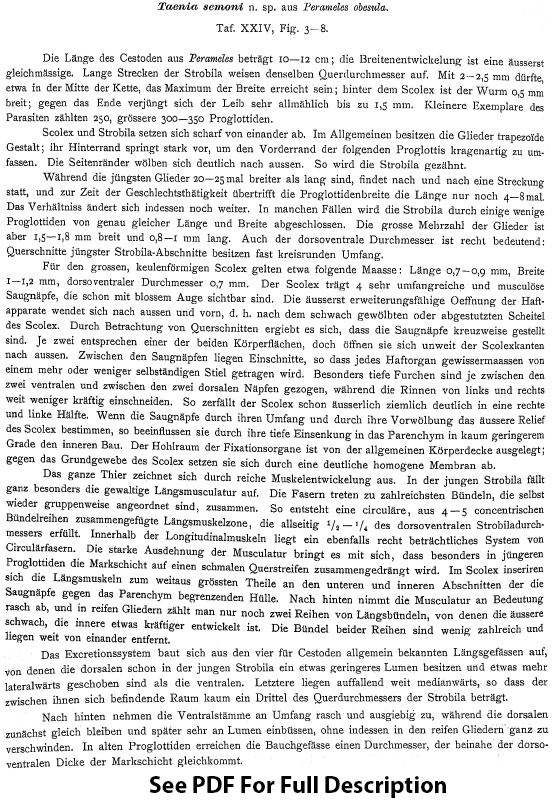 Zschokke, F. 1898. Die Cestoden der Marsupialia und Monotremata. Denkschriften der Medizinisch-Naturwissenschaftlichen Gesellschaft zu Jena 8: 357-380. (4997) Download PDFZschokke, F. 1899. Neue Studien an Cestoden aplacentaler Säugetiere. Zeitschrift für Wissenschaftliche Zoologie 65: 404-445. (4787) Download PDF |