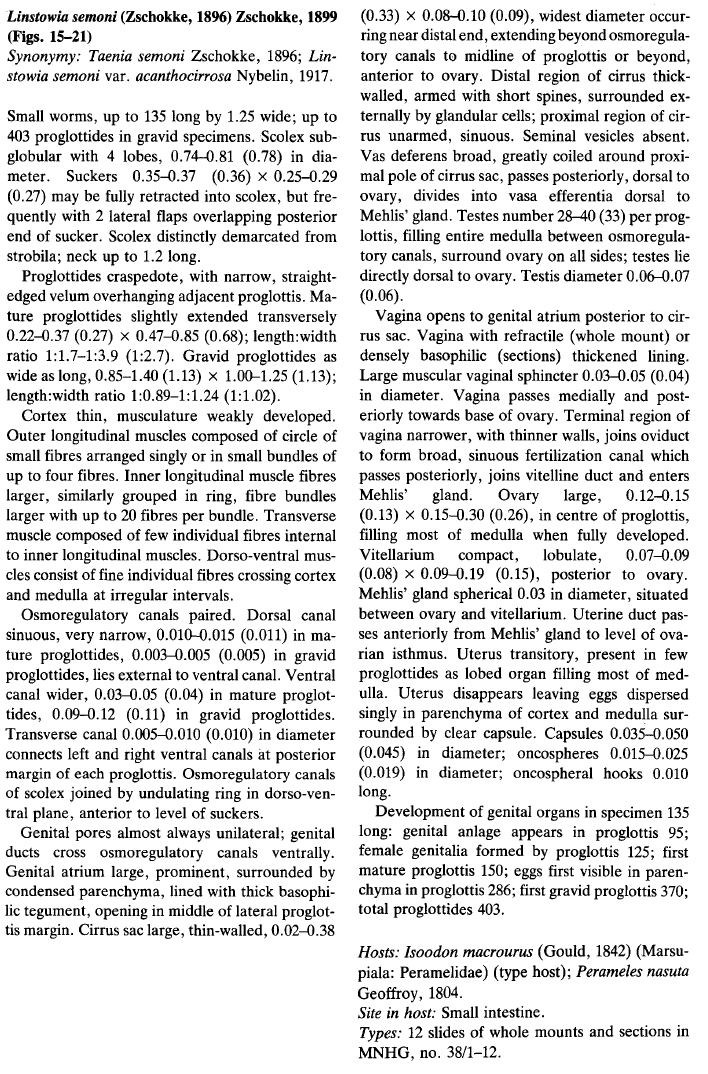 Beveridge, I. 1983. The genus Linstowia Zschokke, 1899 (Cestoda: Anoplocephalidae) in Australian mammals with the description of a new species, L. macrouri. Systematic Parasitology 5: 291-304. (4694) Download PDF |