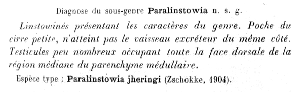 | Scientific Name Notes | Spasskii (1951) also lists LInstowia brasiliensis Janicki, 1904 and Oochoristica brasiliensis (Janicki, 1904) Baer, 1924 as junior synonyms of Paralinstowia iheringi. |
