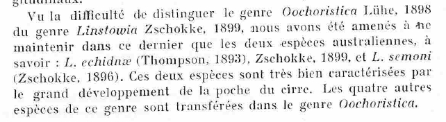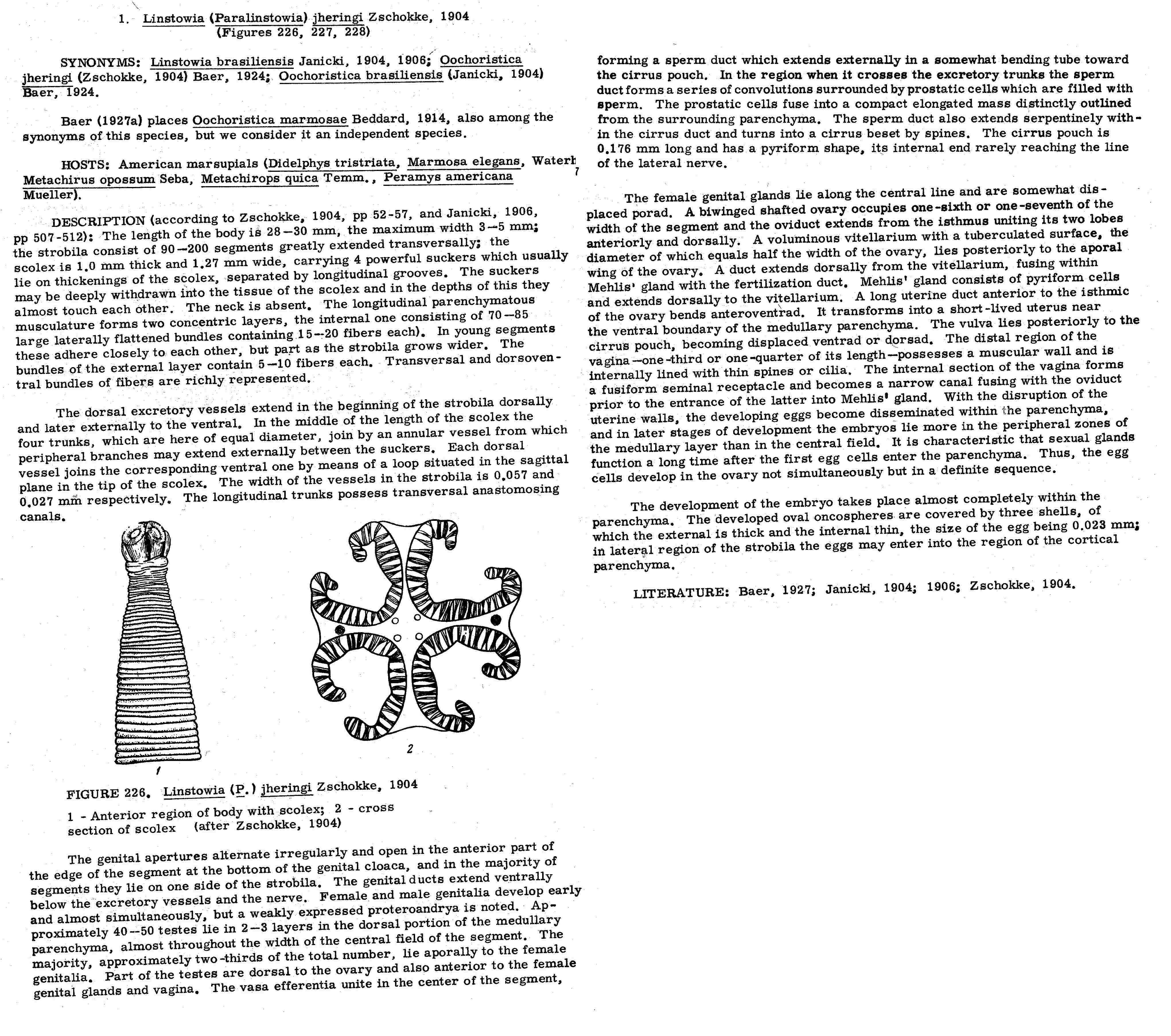 | Scientific Name Notes | Spasskii (1951) also lists LInstowia brasiliensis Janicki, 1904 and Oochoristica brasiliensis (Janicki, 1904) Baer, 1924 as junior synonyms of Paralinstowia iheringi. |