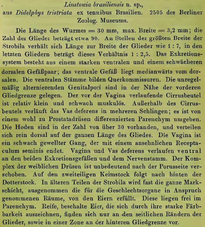 von Janicki, C. 1904. Zur Kenntnis einiger Säugetiercestoden. Zoologischer Anzeiger 27: 770-782. (4754) Download PDFBaer, J.G. 1924. Contribution à la Faune helminthologique sud-africaine. Note préliminaire. Annales de Parasitologie humaine et comparée 2: 239-247. (4615) Download PDF |