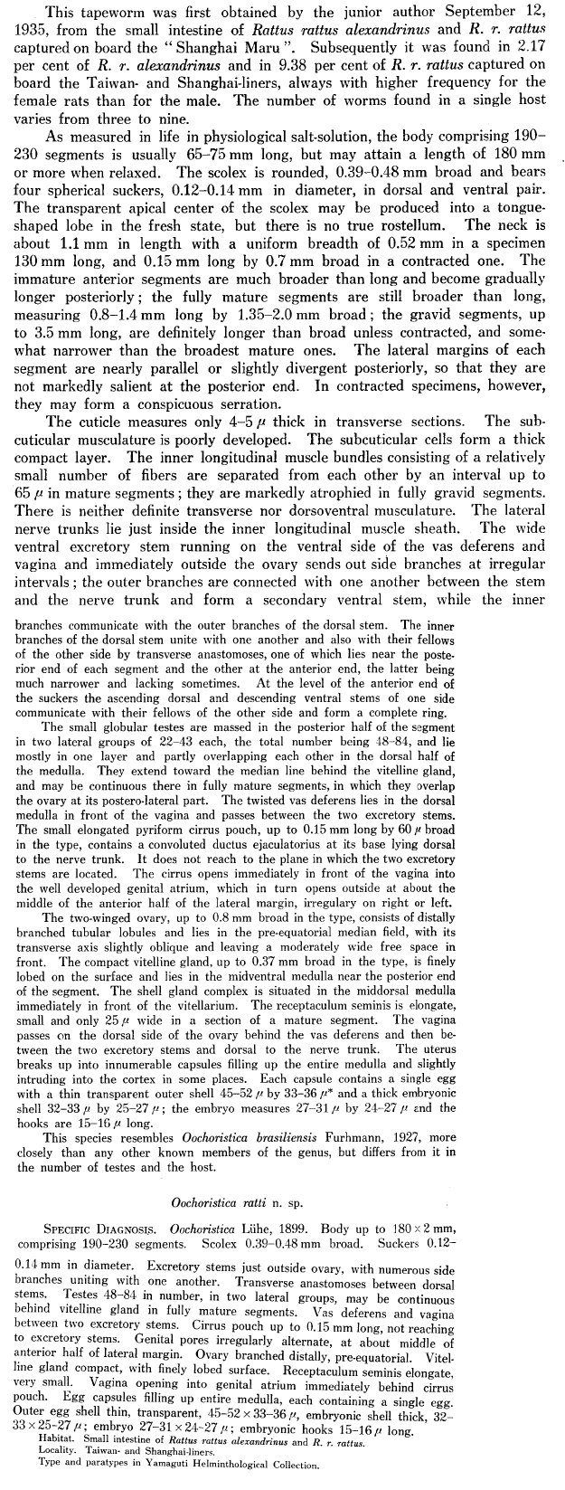 Yamaguti, S. and I. Miyata. 1937. A new tapeworm (Oochoristica ratti) of the family Anoplocephalidae from Rattus rattus rattus and Rattus r. alexandrinus. Japanese Journal of Zoology 7: 501-503. (5415) Download PDF |