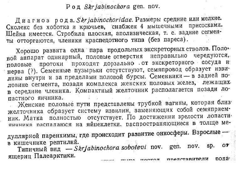 Spasskii, A. A. 1948. [A new cestode family Skrjabinochoridae fam. nov., characterized by complete absence of uteri] (in Russian). Novoe cemejstvo cestod Skrjabinochoridae fam. nov., harakterizuyuscheesya polnym otsustviem matki. Dokl. Akad. Nauk SSSR 59: 409-412.