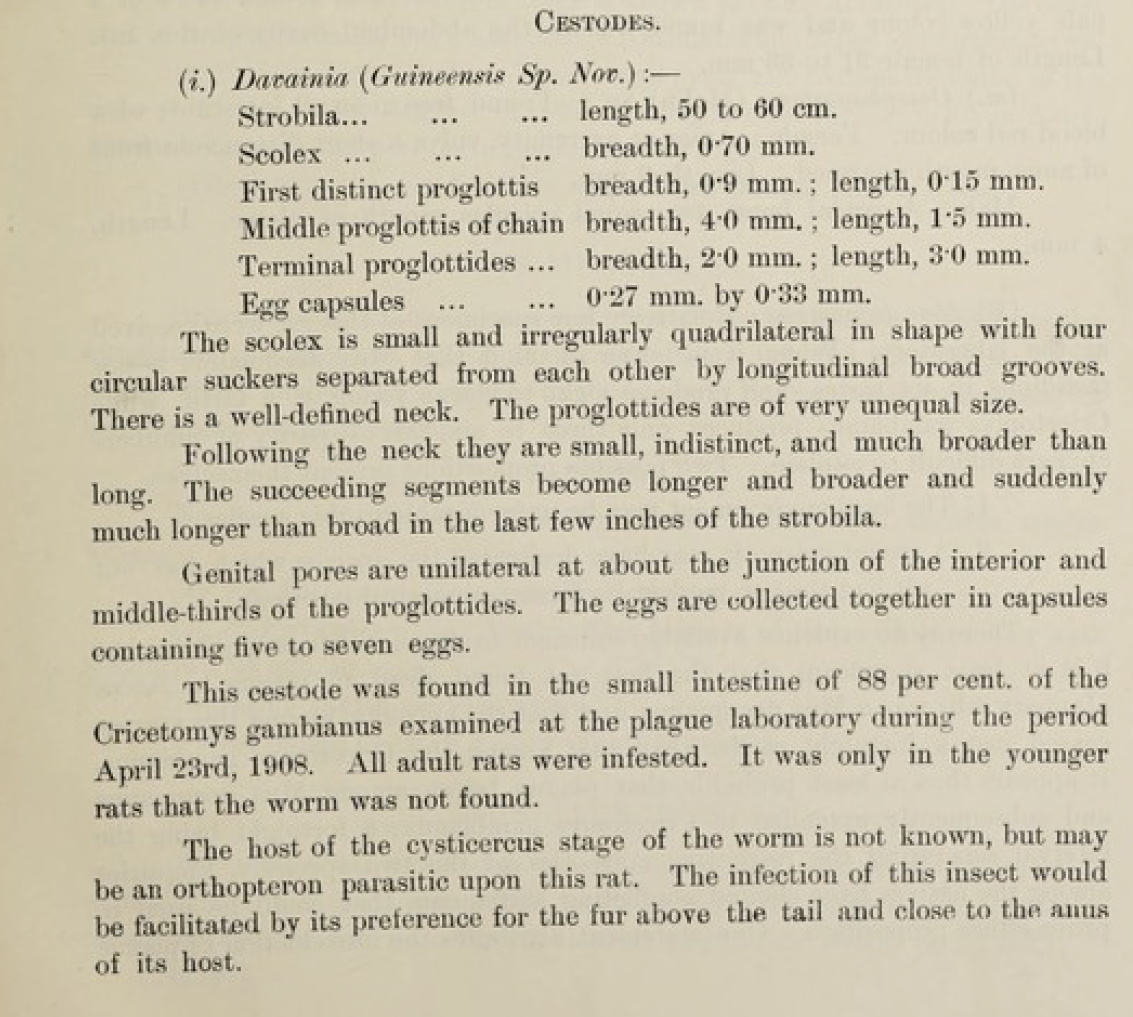 Graham, W. M. 1909. Report on the plague laboratory at Accra, 1908. In Report on plague in the Gold Coast in 1908, W. J. Simpson. J. & A. Churchill, London, 21-26 pp. (7452)Baer, J.G. 1924. Contribution à la Faune helminthologique sud-africaine. Note préliminaire. Annales de Parasitologie humaine et comparée 2: 239-247. (4615) Download PDF |
