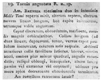 Rudolphi, C. A. 1819. Entozoorum synopsis, cui accedunt mantissa duplex et indices locupletissimi. Sumtibus Augusti Rücker, Berolini (Berlin), 811 pp. (14) Download PDF |