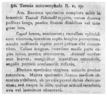 Rudolphi, C. A. 1819. Entozoorum synopsis, cui accedunt mantissa duplex et indices locupletissimi. Sumtibus Augusti Rücker, Berolini (Berlin), 811 pp. (14) Download PDF |