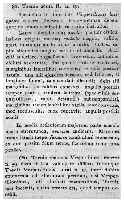 Rudolphi, C. A. 1819. Entozoorum synopsis, cui accedunt mantissa duplex et indices locupletissimi. Sumtibus Augusti Rücker, Berolini (Berlin), 811 pp. (14) Download PDF |