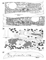 Figs. 24–27. Echinophallus wageneri from Outer Hebrides. Fig. 24. Gravid segment; dorsal view; eggs in uterine sac not illustrated. Fig. 25. Detail of cirrus spines. Fig. 26. Terminal genitalia; ventral view. Fig. 27. Cross-section of segment at the level of cirrus-sac. Abbreviations: co – corpuscles; cs – cirrus-sac; e – eggs; mg – Mehlis’ gland; ov – ovary; sp – sphincter; t – testes;