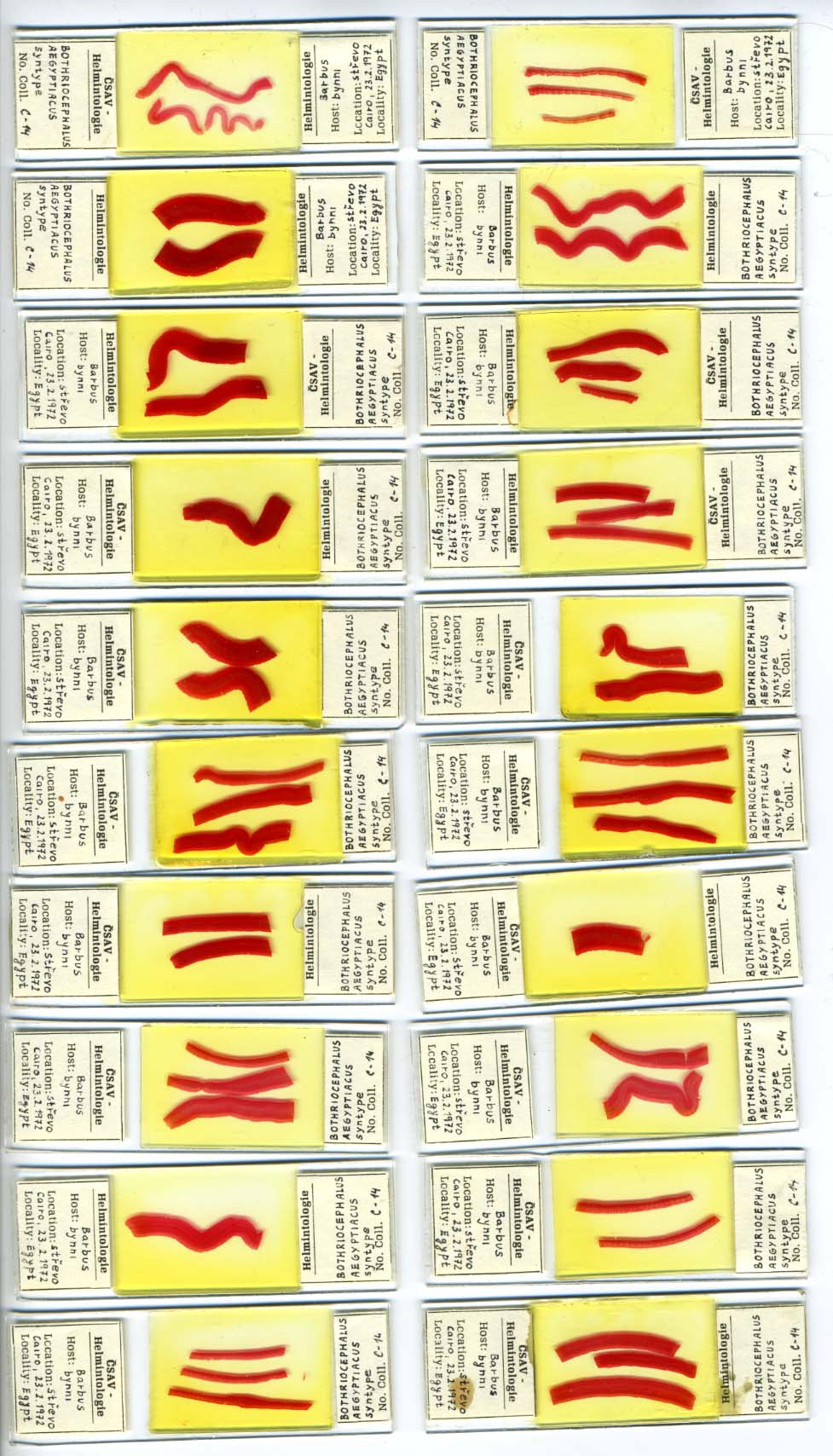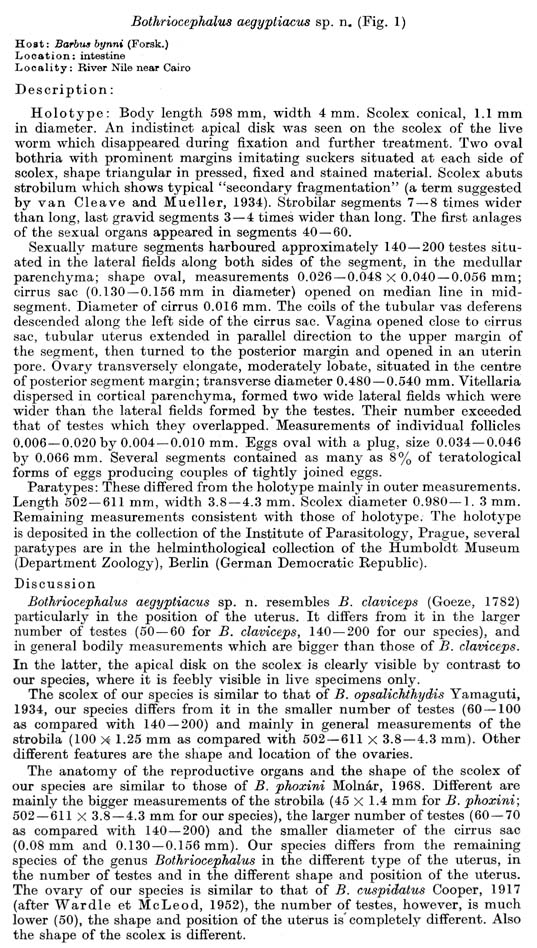 Ryšavý, B. and F. Moravec. 1975. Bothriocephalus aegyptiacus sp. n. (Cestoda: Pseudophyllidea) from Barbus bynni, and its life cycle. Vestník Ceskoslovenské spolecnosti zoologické 39(1): 68-72. (4674) Download PDFBrabec, J., A. Waeschenbach, T. Scholz, D. T. J. Littlewood, and R. Kuchta. 2015. Molecular phylogeny of the Bothriocephalidea (Cestoda): molecular data challenge morphological classification. International Journal for Parasitology 45(12): 761-771. (6634) Download PDF |