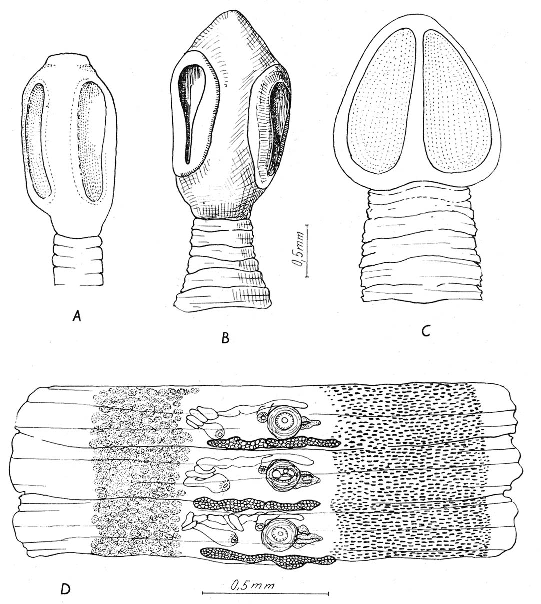Fig. A, B - Scoleces (live material); C - Preserved and fixed scolex; D - Sexually mature segments.