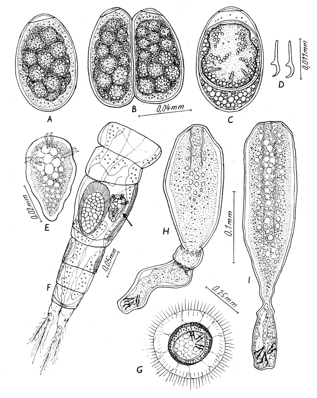 Fig. A - Cleaved egg removed from the uterus after 6 hr; B - Teratological form of double eggs; C - egg with developed coracidium, after 48 hr of development; D - Embryone hooks of the coracidium; E - Oncosphere preserved out of the body cavity of Mesocyclops leuckarti; F - posterior extremity of Mesocyclops leuckarti containing a 24 hr old oncosphere; G - free coracidium; H - procercoid from the body cavity of Mesocyclops leuckarti on day 7 of development; I - completely formed procercoid on day 8 of development.