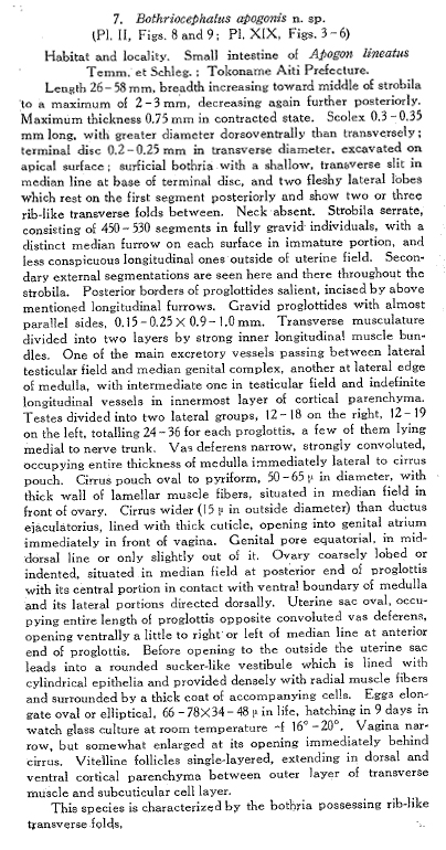 Yamaguti, S. 1952. Studies on the helminth fauna of Japan. Part 49. Cestodes of fishes, II. Acta Medicinae Okayama 8: 1-76. (511) Download PDF |