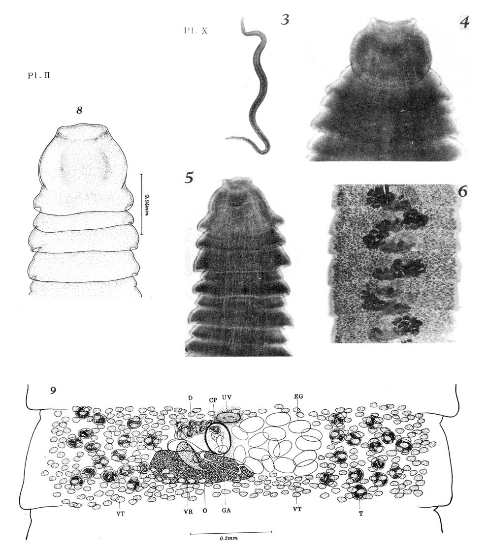 Fig. 3. Bothriocephaius apogonis, 1x. Fig. 4. Scolex of immature specimen of Bothriocephalus apogonis, 75 x. Fig. 5. Scolex of mature specimen of Bothriocephalus apogonis, 35 x. Fig. 6. Gravid proglottides of Bothriocephalus apogonis, 35 x. Fig. 8. Scolex of Bothriocephalus apogonis, lateral view. Fig. 9. Gravid proglottis of Bothriocephalus apogonis, ventral view.
