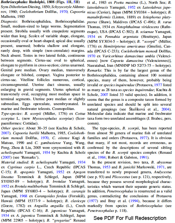 | Type Species | Bothriocephalus scorpii (Müller, 1776) Rudolphi, 1808 |