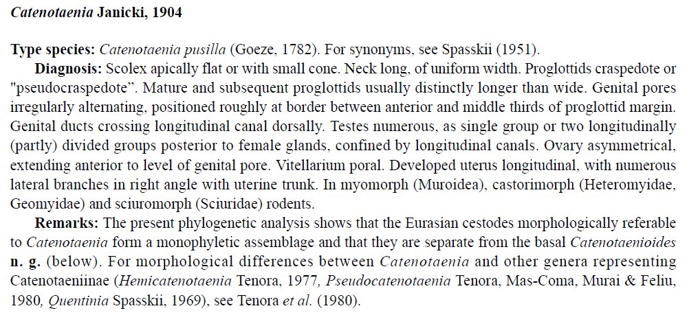 | Synonyms | Pseudocatenotaenia Tenora, Mas-Coma, Murai & Feliu, 1980. |