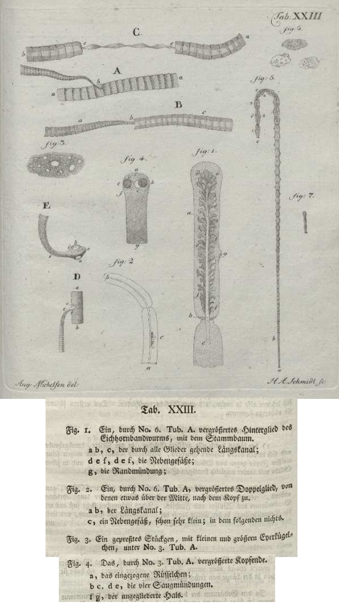 Goeze, J. A. E. 1782. Versuch einer Naturgeschichte der Eingeweidewürmer thierischer Körper. Gedruckt bey Philipp Adam Pape, Blankenburg, 471 pp & 44 plat pp. (4166) Download PDFvon Janicki, C. 1904. Über Säugetiercestoden. Nachtrag und Berichtigung zu der Mitteilung in Nr. 25 dieser Zeitschrift. Zoologischer Anzeiger 28: 230-231. (5136) Download PDF |
