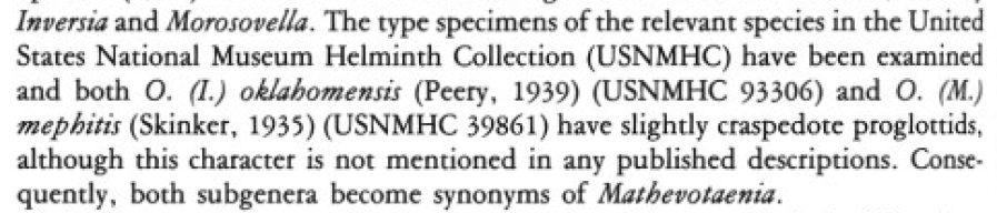 Peery, H. J. 1939. A new unarmed tapeworm from the spotted skunk. Journal of Parasitology 25: 487-490. (5025) Download PDFBeveridge, I. 1994. Family Anoplocephalidae Cholodkovsky, 1902. Keys to the Cestode Parasites of Vertebrates. : 315-366. (4599) Download PDF |