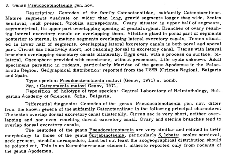 | Type Species | Pseudocatenotaenia matovi (Genov, 1971) Tenora, Mas-Coma, Murai & Feliu, 1980 |