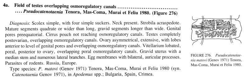 Tenora, F., S. Mas-Coma, E. Murai, and C. Feliu. 1980. The system of cestodes of the suborder Catenotaeniata Spassky, 1963. Parasitologica Hungarica 13: 39-57. (5138) Download PDFHaukisalmi, V., A. Ribas, K. Junker, A. Spickett, S. Matthee, H. Henttonen, J. Jrijer, A. Halajian, J. L. Anders, and M. Nakao. 2018. Molecular systematics and evolutionary history of catenotaeniid cestodes (Cyclophyllidea). Zoologica Scripta 47: 221-230. (7061) Download PDF |