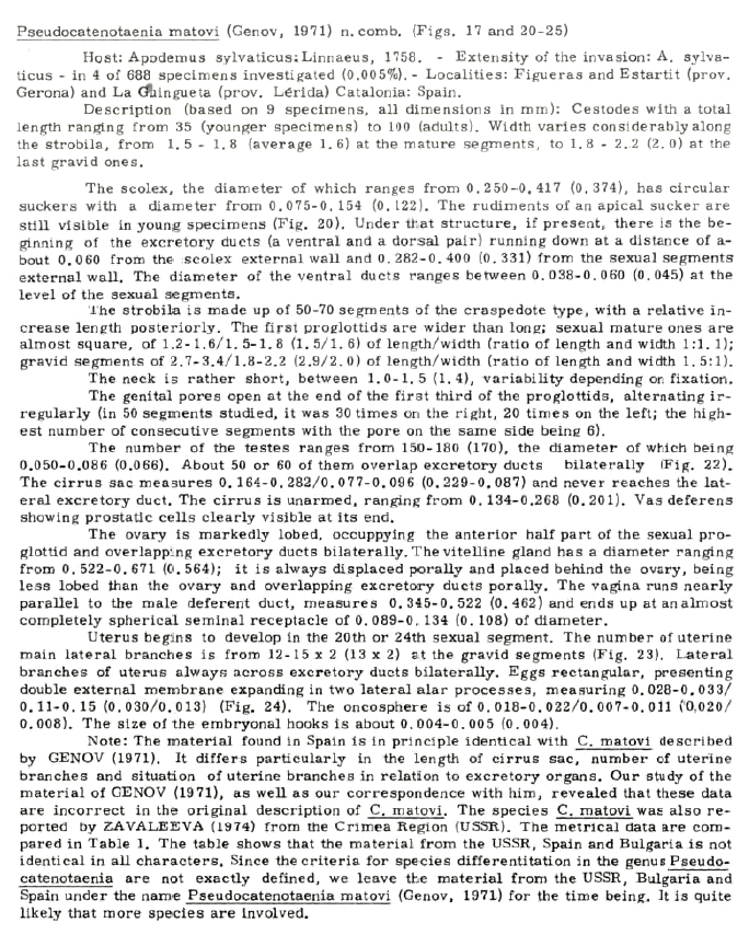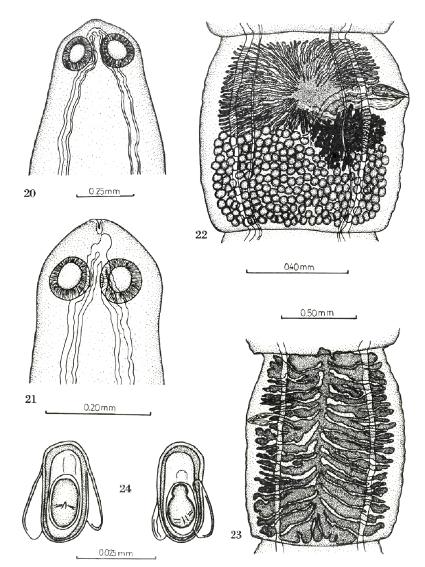 Figs. 20-25: Pseudocatenotaenia matovi of Apodemus sylvaticus from Spain. 20= scolex of young specimen showing the rest of the larval apical sucker; 21= scolex of adult specimen; 22= sexual mature segment; 23= gravid segment; 24= eggs