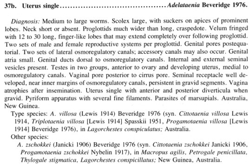 Lewis, R. C. 1914. On two new species of tapeworms from the stomach and small intestine of a wallaby, Lagorchestes conspicillatus, from Hermite Island, Monte Bello Islands. Proceedings of the Zoological Society of London 1914: 419-433. (4675) Download PDFSchmidt, G. D. 1986. Handbook of tapeworm identification. CRC Press, Boca Raton, Florida, 675 pp. (660) Download PDF |