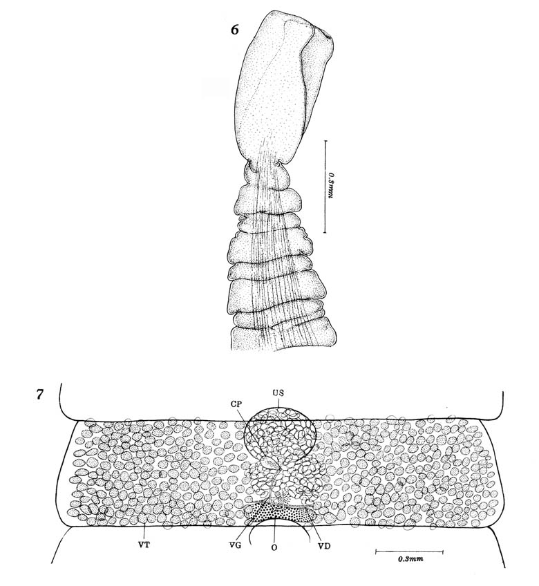 Fig. 6. Scolex of Bothriocephalus brotulae, ventrolateral view. Fig. 7. Gravid proglottis of Bothriocephalus brotulae, dorsal view.