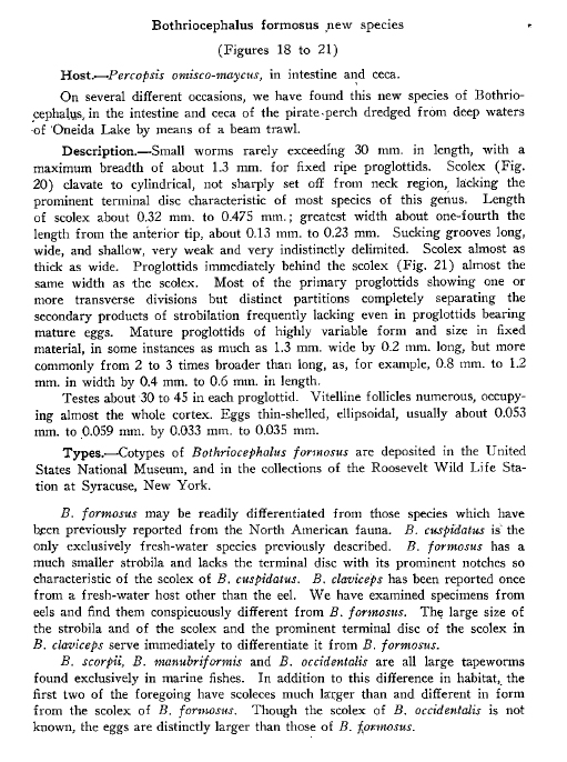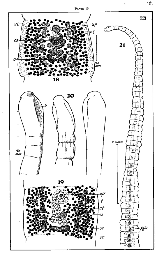 Plate 19. Bothriocephalus formosus new species. Fig 18. Proglottid of B. formosus, from middle of chain, just before commencement of egg formation. Testes distinct. Ovary somewhat farther forward than usual. Dorsal surface (uterine pore up). Fig. 19. Proglottid somewhat farther back than the one shown in Fig. 18. Eggs beginning to accumulate in uterus. Testes indistinct. Dorsal surface. Fig. 20. Three scolices of B. formosus, showing shallow bothria and general character of the head. Fig. 21. Anterior region of a strobila of B. formosus, showing form and general appears anterior to the region of gravid proglottids. Abbreviations: b—bothria, cs—cirrus sac, ov—ovary, pgo—primordia of reproductive organs, t—testes, up—uterine pore, ut—uterus, vt—vitellaria