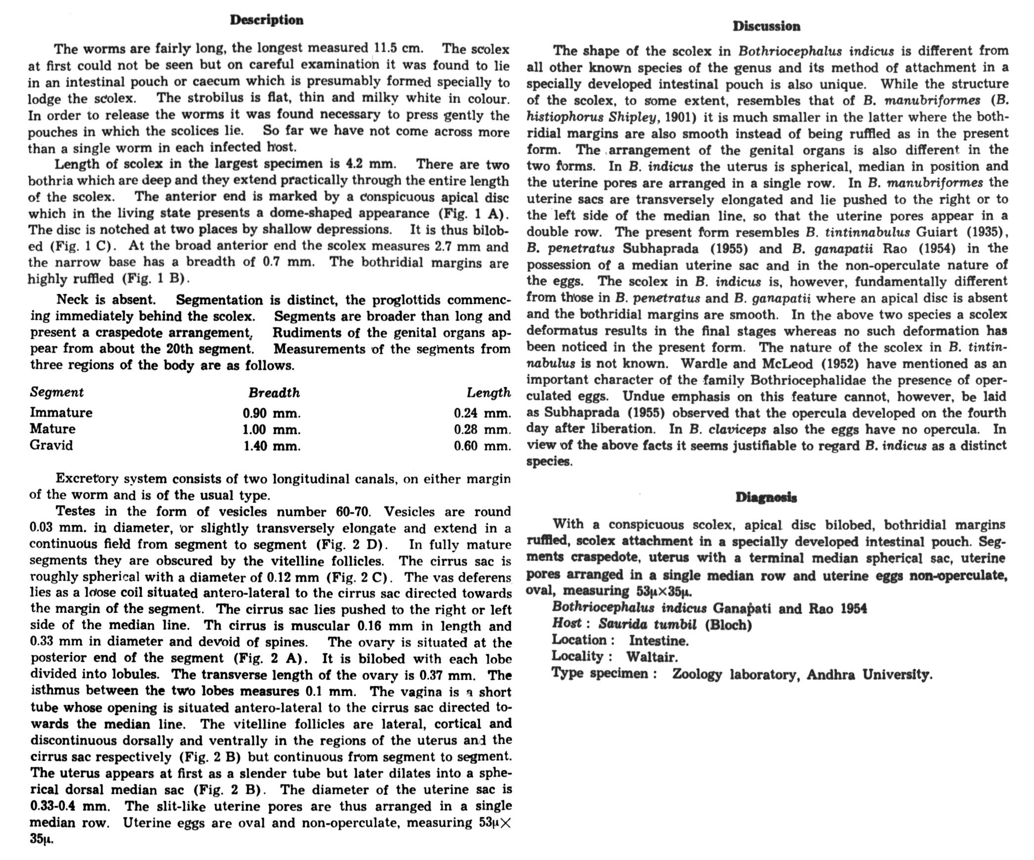 Ganapati, P. N. and K. Hanumantha Rao. 1955. On Bothriocephalus indicus sp. nov. (Cestoda) from the gut of marine fish, Saurida tumbil (Bloch). Journal of the Zoological Society of India 7: 177–181. (4805) Download PDF |
