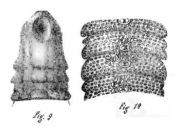Fig. 9. Bothriocephalus monticellii n. sp.: Scolex viewed from the side (enlarged). Fig. 10 mature proglottids.