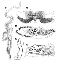 Penetrocephalus ganapattii (Rao, 1954) ex Saurida micropectoralis (IPCAS C-462/2). 9, 12, Schematic drawing of scolex deformatus. 10, Schematic drawing of mature segment; vitelline follicles illustrated only in the posterior segment; ventral view. 11, 13, Histological sections of gravid segments at the level of cirrus-sac; 11, cross-section; 13, sagittal section. Abbreviations: cs – cirrus-sac; e – eggs; lm – inner longitudinal muscles; ov – ovary; t – testes; us – uterine sac; vf – vitelline follicles.
