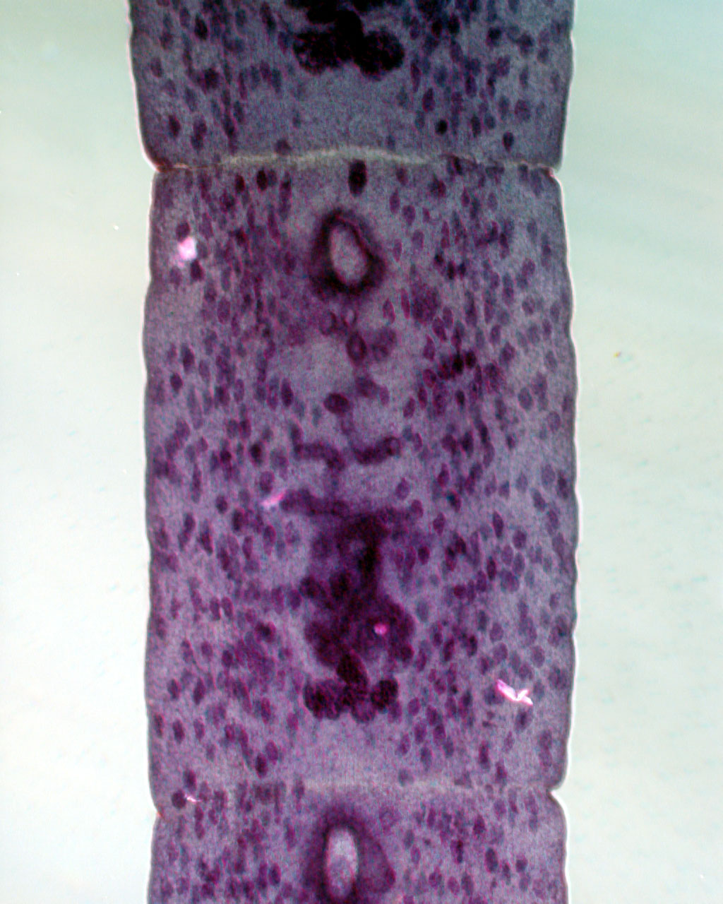Fig. 8.-Early developing proglottid showing in ventral view testes, excretory ducts, genital complex, uterine tube and pore.