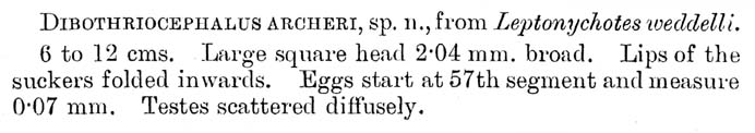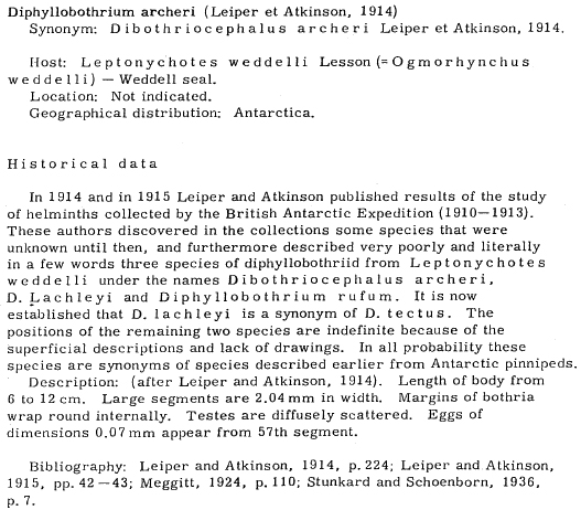 | Valid Name | Diphyllobothrium archeri (Leiper & Atkinson, 1914) Meggitt, 1924 |
