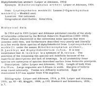 Leiper, R. T. and E. L. Atkinson. 1914. Helminthes of the British Antarctic Expediton, 1910-1913. Proceedings of the Zoological Society of London 1: 222-226. (564) Download PDFDelyamure, S. L. 1955. Helminthofauna of marine mammals (ecology and phylogeny). Israel Program for Scientific Translations 1968, Jerusalem, 522 pp. (4208) Download PDF |