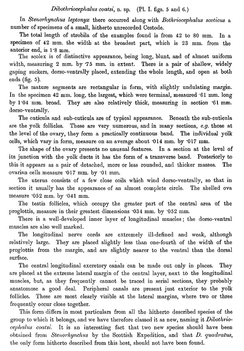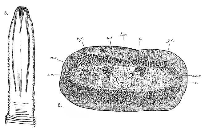 Fig. 5. Scolex of Dibothriocephalus coatsi, n. sp. Fig. 6. Transverse section of D. coatsi.