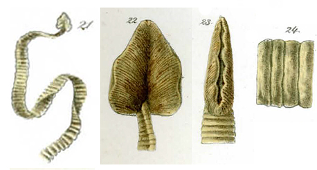 Fig. 21-24. Dibothrium Folium Herpestis leucuri 21. Animal in natural size; 22. head broadened like a leaf; 23. Front end of
