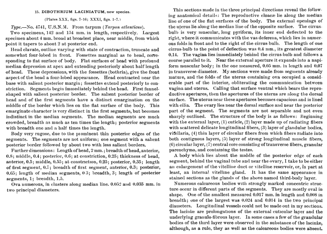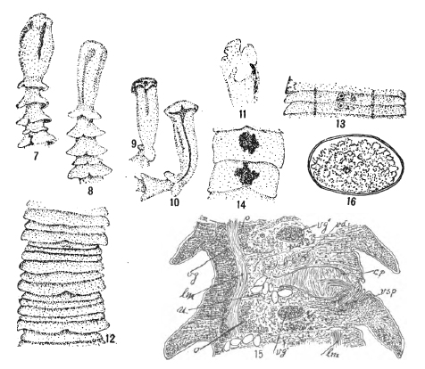Fig. 7. Head and anterior segments; 12x. Fig. 8. Same specimen, lateral view; 12x. Fig. 9. Another specimen, marginal view, corresponding to lateral margin of body; 12x. Fig. 10. Anterior view of same... MoreFig. 7. Head and anterior segments; 12x. Fig. 8. Same specimen, lateral view; 12x. Fig. 9. Another specimen, marginal view, corresponding to lateral margin of body; 12x. Fig. 10. Anterior view of same specimen; 12x. Fig. 11. Front view of head; 12x. Fig. 12. Antero-median segments; 12x. Fig. 13.Postero-median segments; 12x. Fig. 14. Posterior segments; 12x. Fig. 15. Longitudinal ventral section. Zeiss 2/A, draw-tube open, vg, inner viteline gland. |
