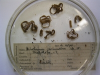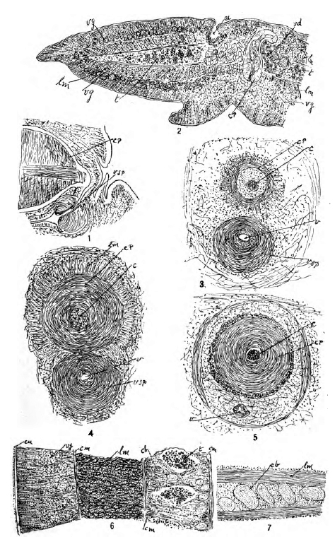 Fig. 1. Genital cloaca with external end og cirrus-pouch and vagina spincter, from longitudinal, ventral section. Zeiss 2/A, draw-tube closed. Fig. 2. Part of transverse section of body through cirrus... MoreFig. 1. Genital cloaca with external end og cirrus-pouch and vagina spincter, from longitudinal, ventral section. Zeiss 2/A, draw-tube closed. Fig. 2. Part of transverse section of body through cirrus-pouch and external, dorsal, opening of uterus. Zeiss 2/A, draw-tube closed. Fig. 3. Section of cirrus and cirrus-pouch and vaginal sphincter, near ventral surface, from longitudinal, horizontal section of body. Zeiss 2/A, draw-tube open. Fig. 4. Same, section made a little deeper in body, lm, longitudinal muscles of cirrus-bulb, Fig. 3. Zeiss 2/A, draw-tube open. Fig. 5. Section of cirrus and cirrus-pouch and vagina, from longitudinal, horizontal section of body, not so much magnified as 3 and 4. Zeiss 2/A, draw-tube closed. Fig. 6. Portion of transverse section. Zeiss 2/A, draw-tube closed. Fig. 7. Longitudinal muscles and calcereous bodies. Zeiss 2/A, draw-tube open. |