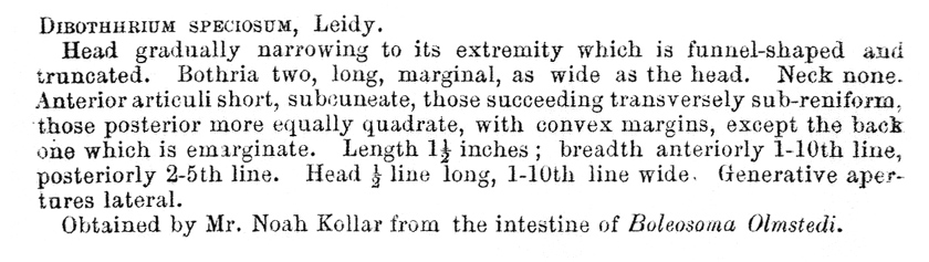 | Synonyms | Bothriocephalus speciosus (Leidy, 1858) Leidy, 1872 |