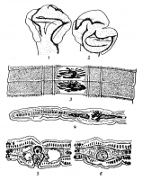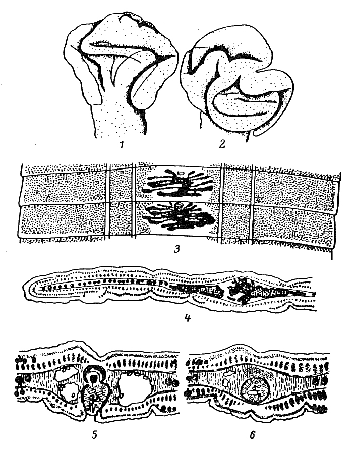 78. Diphyllobothrium fuhrmanni Hsü, 1935: 1 - scolex ventrally; 2 - the same apically; 3 - segments; 4 - transverse section of a segment in the region of the ovary; 5, 6 - transverse sections in the region of the bursa (after Yamaguti, 1935).